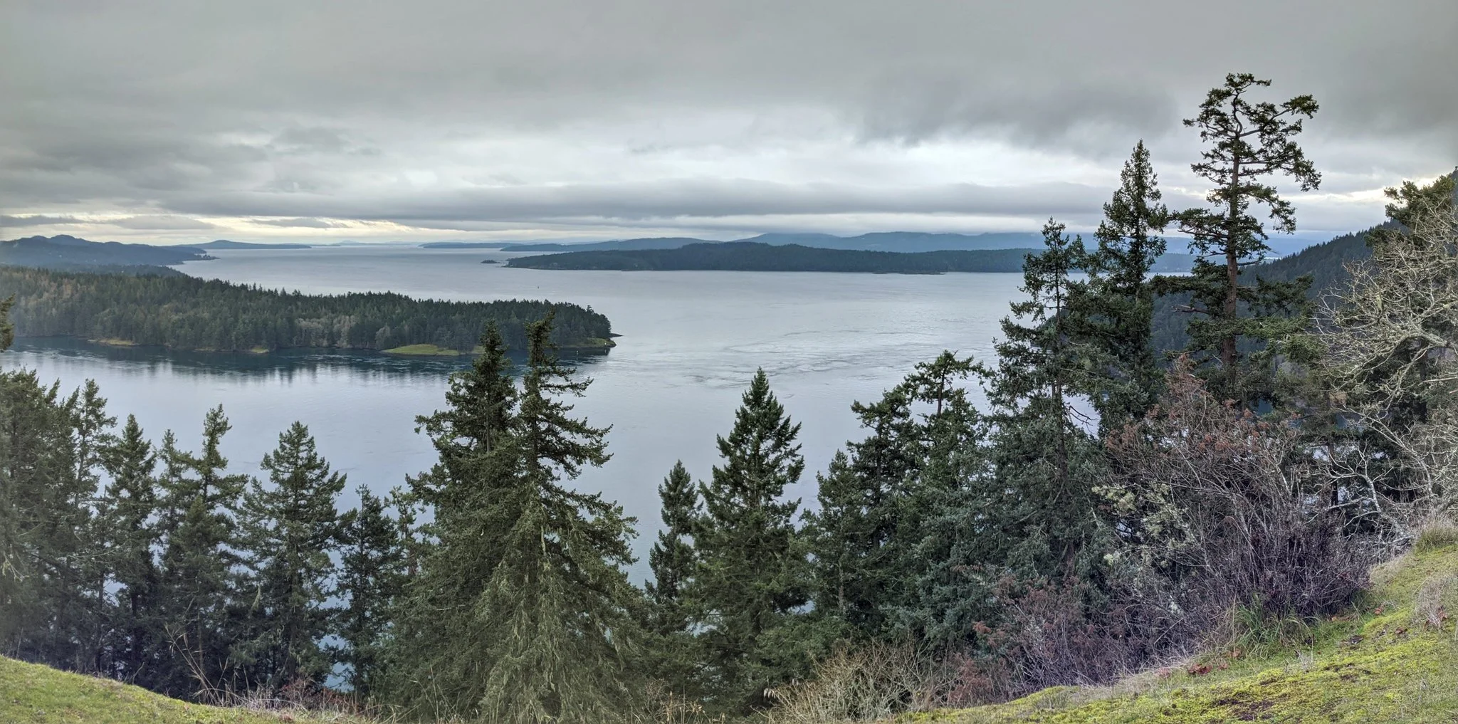 Gradient is perched on an island hillside meadow, surrounded by forest, overlooking the Salish Sea at the border of Washington state and British Columbia.